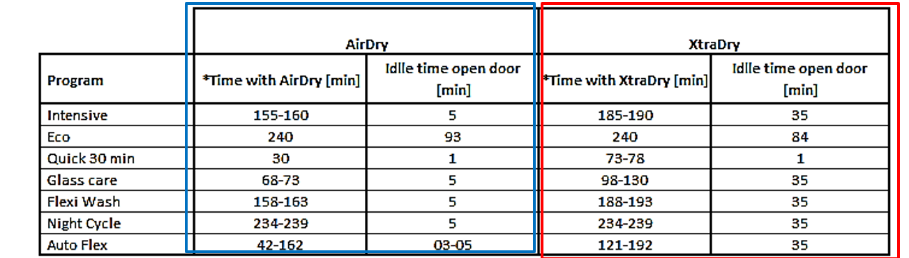 Ekli tabloda yıkama proğramalrı ve kapak açma süreleri gösterilmektedir;
