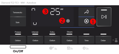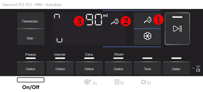 5 . Deterjan tankı düğmesine (1) tekrar dokunun. Ekranda depo göstergesi (2) ve varsayılan deterjan seviyesi (3) gösterilir.