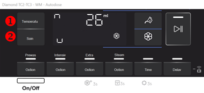 10. Yumuşatıcı deposu düğmesine (1) tekrar dokunun. Ekranda depo göstergesi (2) ve varsayılan deterjan seviyesi (3) gösterilir.