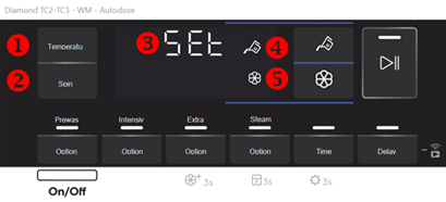 1 . Konfigürasyon moduna girmek için, ekranda (solda) ve yanıp sönen deterjan deposunda (4) ve yumuşatıcı ekranda “SET” (3) görünene kadar Sıcaklık (1) ve Sıkma (2) düğmelerine aynı anda basın. sağda depo (5) göstergeleri.