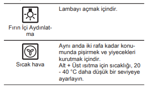 - Fırın ışığı belirli fonksiyonları / ayarları / programları kapatır